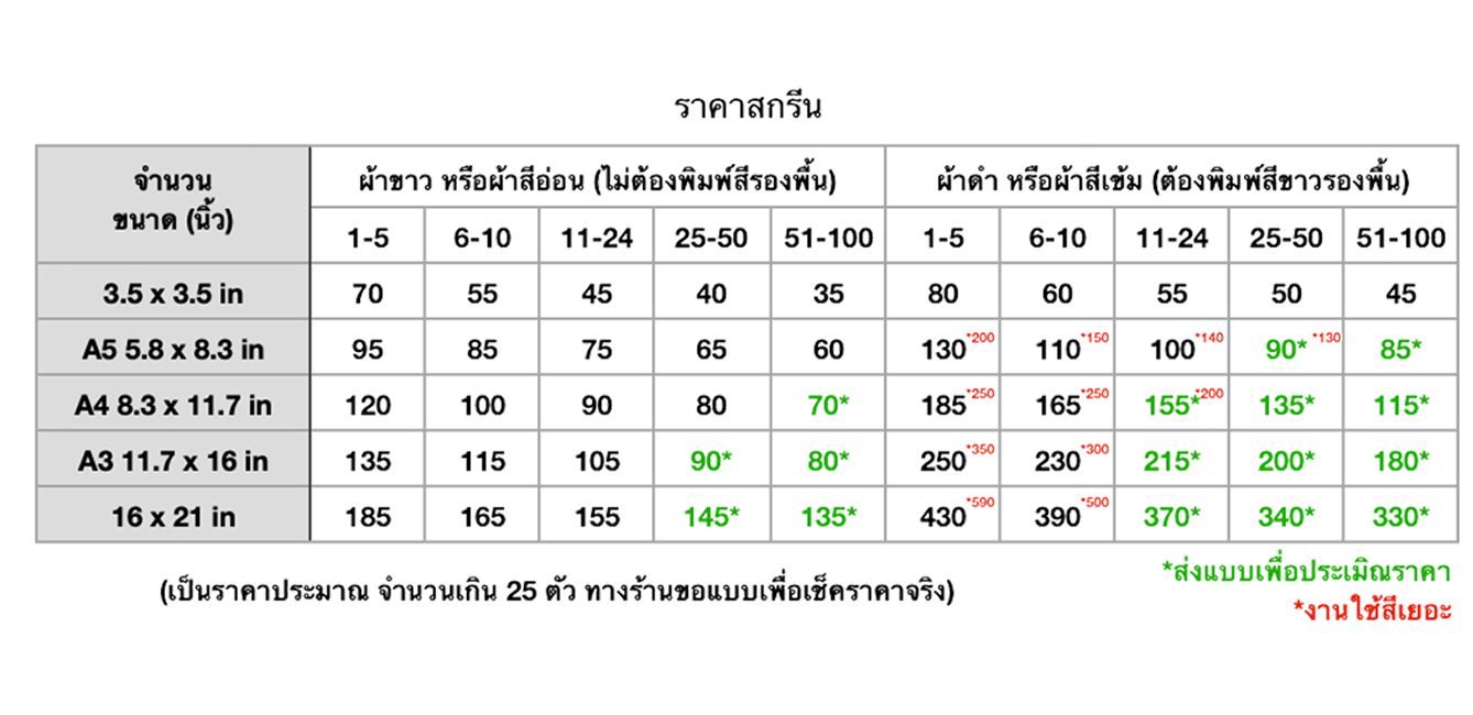 Premium-DTG (พรีเมี่ยมดีทีจี) ราคาประเมินจากการใช้น้ำหมึกในการสกรีน และอิงจากในตารางทั้งสองตารางนี้